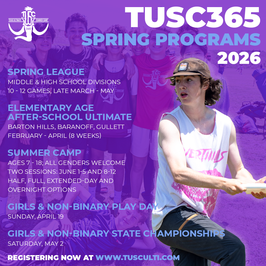 TUSC is developing a vision and plan for YEAR-ROUND youth Ultimate programming, and we want to hear from YOU! Please consider filling out this short google form to help inform our decisions and offerings. Thanks in advance for your input!